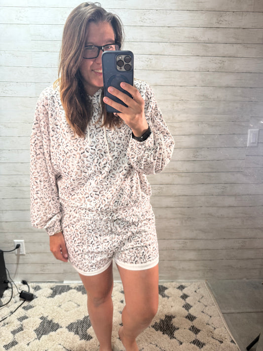 Drawstring Leopard Long Sleeve Hooded Top and Shorts Set